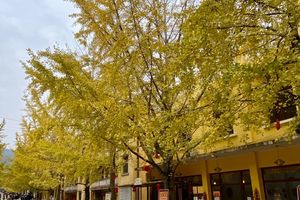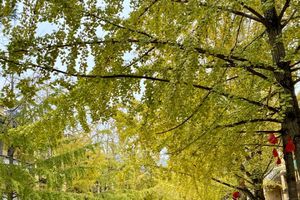 在朝日照射下金灿灿的银杏叶,簇拥在粗壮的枝条上,微风轻抚,万千片黄叶轻颤,犹如万千彩蝶飞舞;站在银杏林中,透过冬日灿烂阳光,银杏叶散发出道道璀璨金光,在秋冬中添上一番色彩。