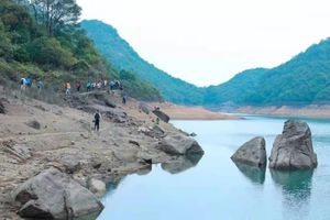 湖水的碧绿、堤岸的土黄、山体的苍翠