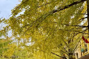 在朝日照射下金灿灿的银杏叶,簇拥在粗壮的枝条上,微风轻抚,万千片黄叶轻颤,犹如万千彩蝶飞舞;站在银杏林中,透过冬日灿烂阳光,银杏叶散发出道道璀璨金光,在秋冬中添上一番色彩。