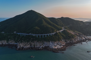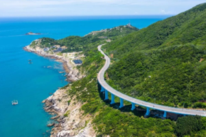 这里被称为“中国最美环岛绿岛”。左边是青山,右边是一望无际的大海.