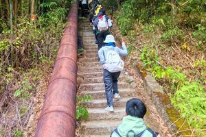 10:30 左右到达山脚登山起点后,收拾行装,整理心情,热身后出发开始登山 ,建议穿长袖衣裤、使用登山杖和护膝,有急升坡,坡陡、路滑、有悬崖、有密林